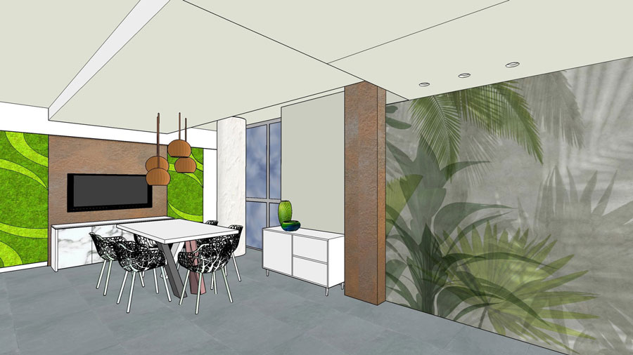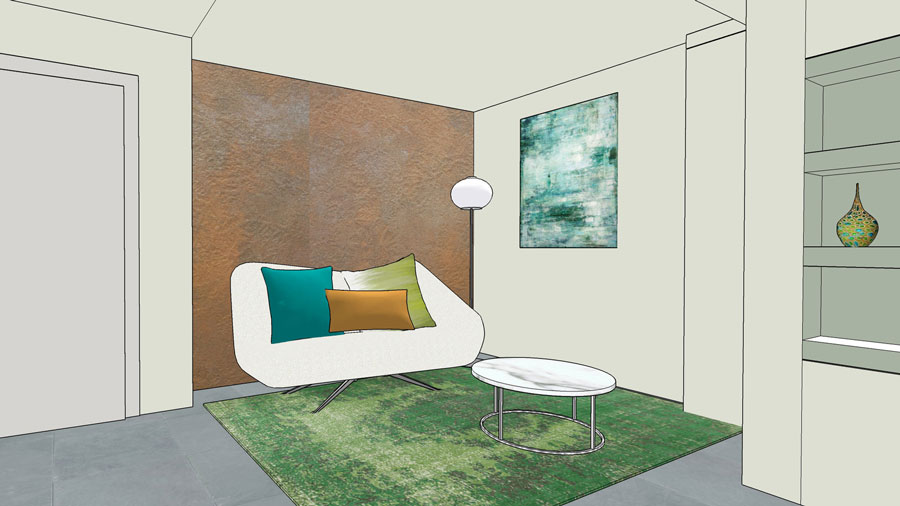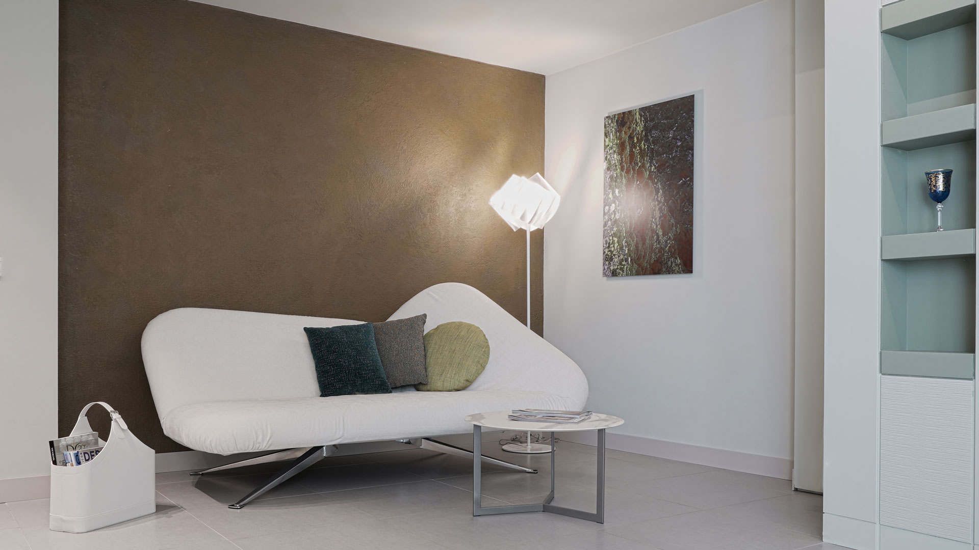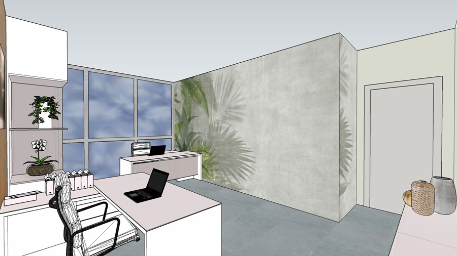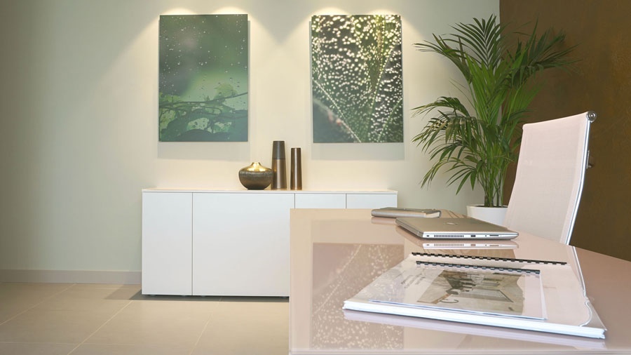 Per il restyling di un ufficio di Brescia sono state scelte tinte pastello e colori tenui per le pareti con varie tonalità di verdi e marroni, sia per la tinteggiatura che per la carta da parati, o ancora nella scelta delle fotografie che riproducono elementi naturali.