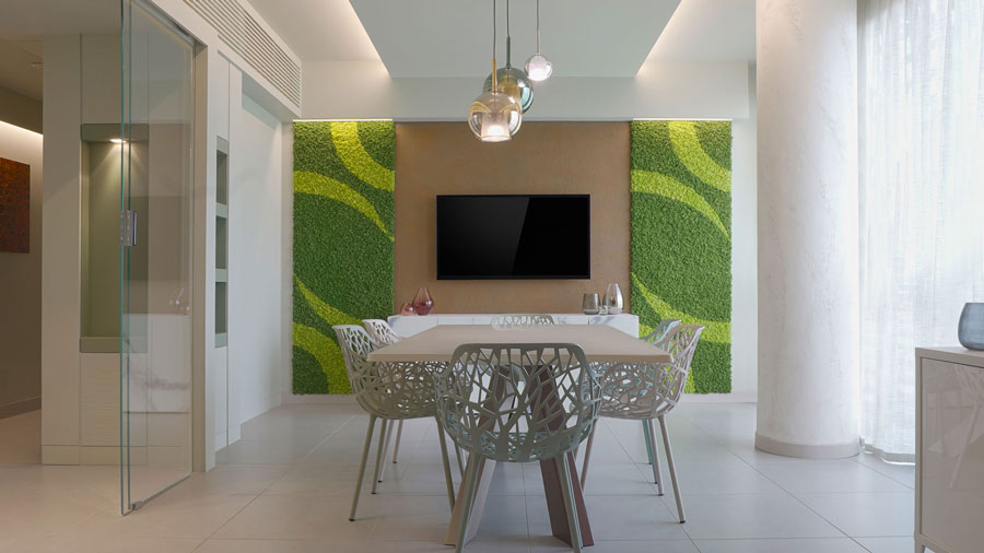 Nella sala riunioni sono stati inseriti due pannelli su misura di lichene stabilizzato, che non solo combina eleganza e relax, ma migliora la qualità dell’aria; anche la scelta delle sedie Forest è un richiamo alla natura e rendono l’ambiente originale ed esteticamente gradevole.
